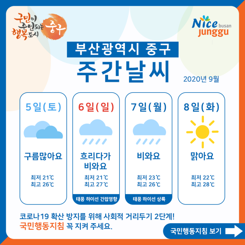 주말예보는 화요일 19시부터 금요일 17시까지 발표합니다. 부산 주간 날씨 이번주 가마솥 더위가 계속 맹위를 떨치고 있다. 절기상 10월 8일은 이슬이 맺힌다는 한로이지만 기온은 평년 수준을 웃돌것으로 예상됩니다.
